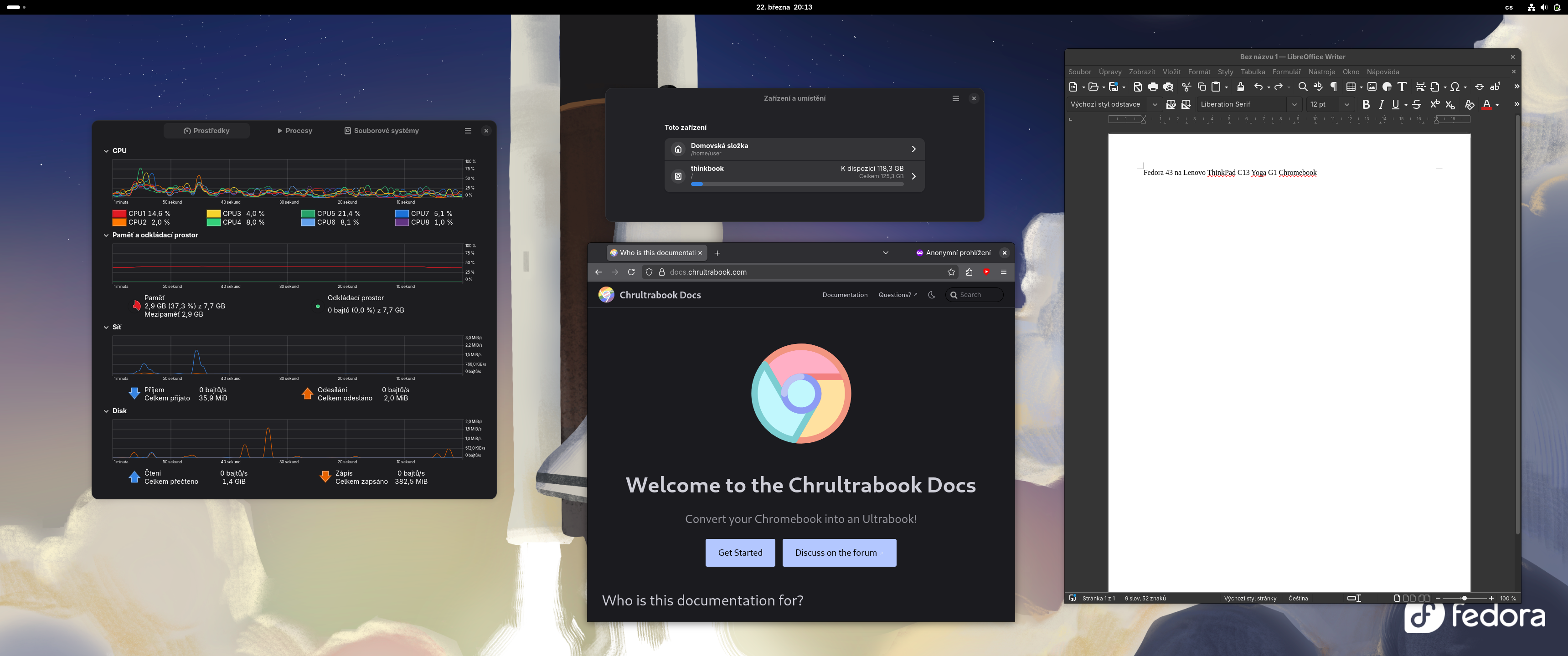 Příjemně mě překvapilo, jak je notebook s Fedorou svižný. Oba USB-C porty podporují připojení monitoru / docku. Myslím, že skvěle poslouží jako kancelářské PC / tablet. Notebook sice nemá rozšiřitelnou RAM, ale Fedora je o něco méně “rožežraná” v porovnání s Windows. takže pokud člověk neprogramuje a nestříhá video, dovedu si představit Yogu jako “daily driver”.